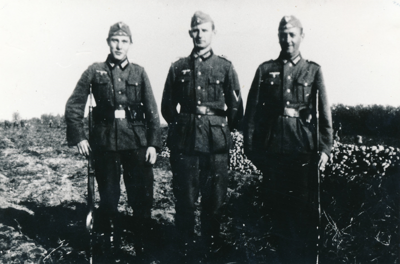 Hermann Otto Baltutt around 1938 as a soldier in the German Army. The two men to his left and right are unknown. Given Otto's rank (Gefreiter or Lance Corporal) and his being unarmed but the other two being armed, it is possible that this photo is a posed photo of them as some kind of honor guard (my speculation).